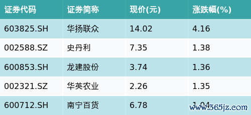 截至收盘牛犇配资,农村电商主题涨跌幅最高的五只股票为:华扬联众(603825.SH)、史丹利(002588.SZ)、龙建股份(600853.SH)、华英农业(002321.SZ)与南宁百货(600712.SH)。详情见下表: