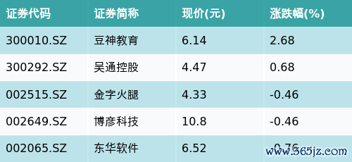 截至收盘温州期货配资,微信小程序主题涨跌幅最高的五只股票为:豆神教育(300010.SZ)、吴通控股(300292.SZ)、金字火腿(002515.SZ)、博彦科技(002649.SZ)与东华软件(002065.SZ)。详情见下表: