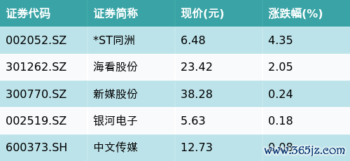 截至收盘,广电系主题涨跌幅最高的五只股票为:*ST同洲(002052.SZ)、海看股份(301262.SZ)、新媒股份(300770.SZ)、银河电子(002519.SZ)与中文传媒(600373.SH)。详情见下表:
